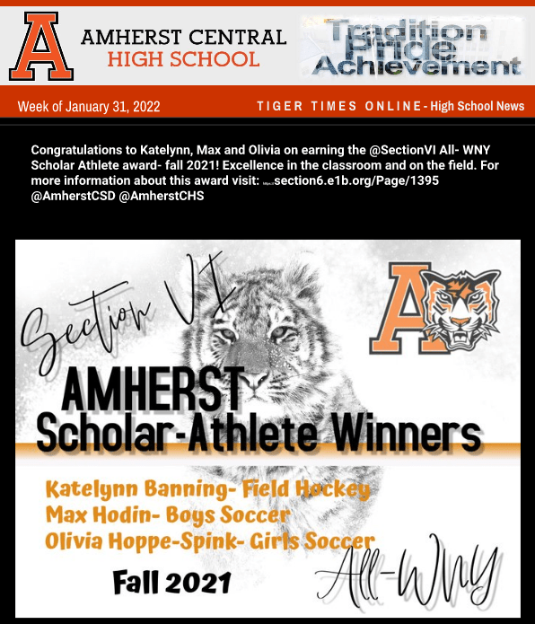 Here the our latest issue of ACHS Tiger Times Online (TTO) for the week of January 31, 2022 – Amherst Central High School’s weekly digital newsletter.