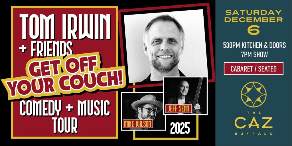 Tom Irwin, 1984 Amherst Central High School Grad, is a national touring comedian based in Los Angeles California. He is a founding member of GIs Of Comedy. Tom has been featured on Talk Of The Nation, This American LIfe, and performed his one person show “25 Days In Iraq” at The White House in Washington DC. Featuring Mike Wilson of Austin TX (Austin High / Standup Empire) and special musical guest Jeff Senn of Nashville TN (Wynona Judd / Trisha Yearwood / Paul Brandt). GET OFF THE COUCH! for Tom Irwin & Friends Comedy & Music Tour 2025!